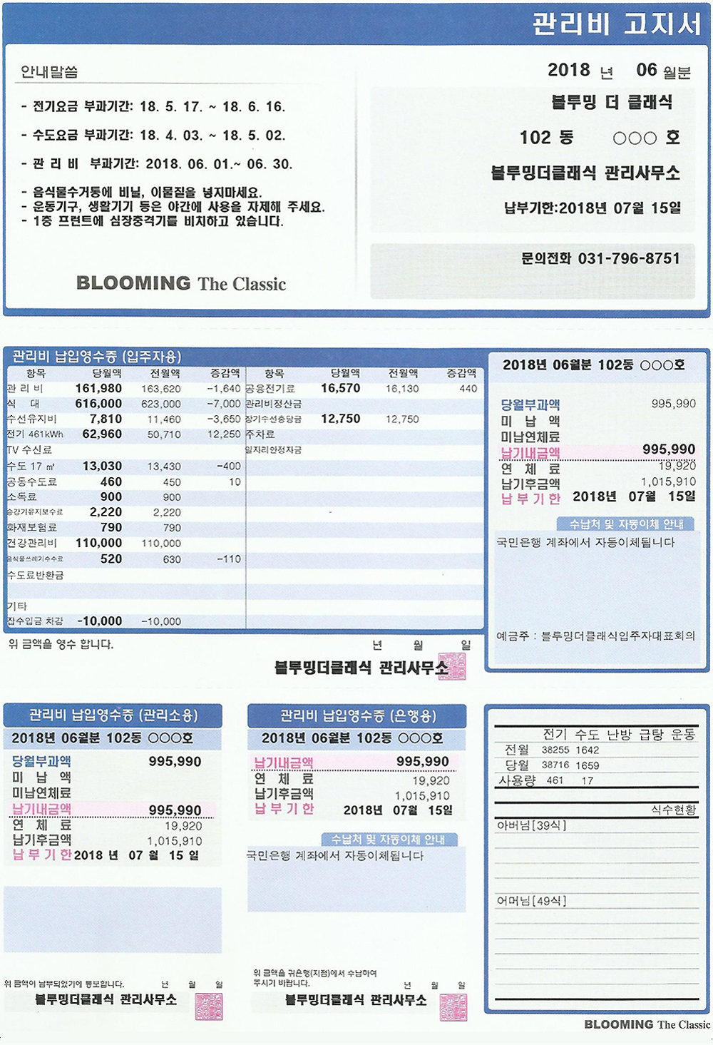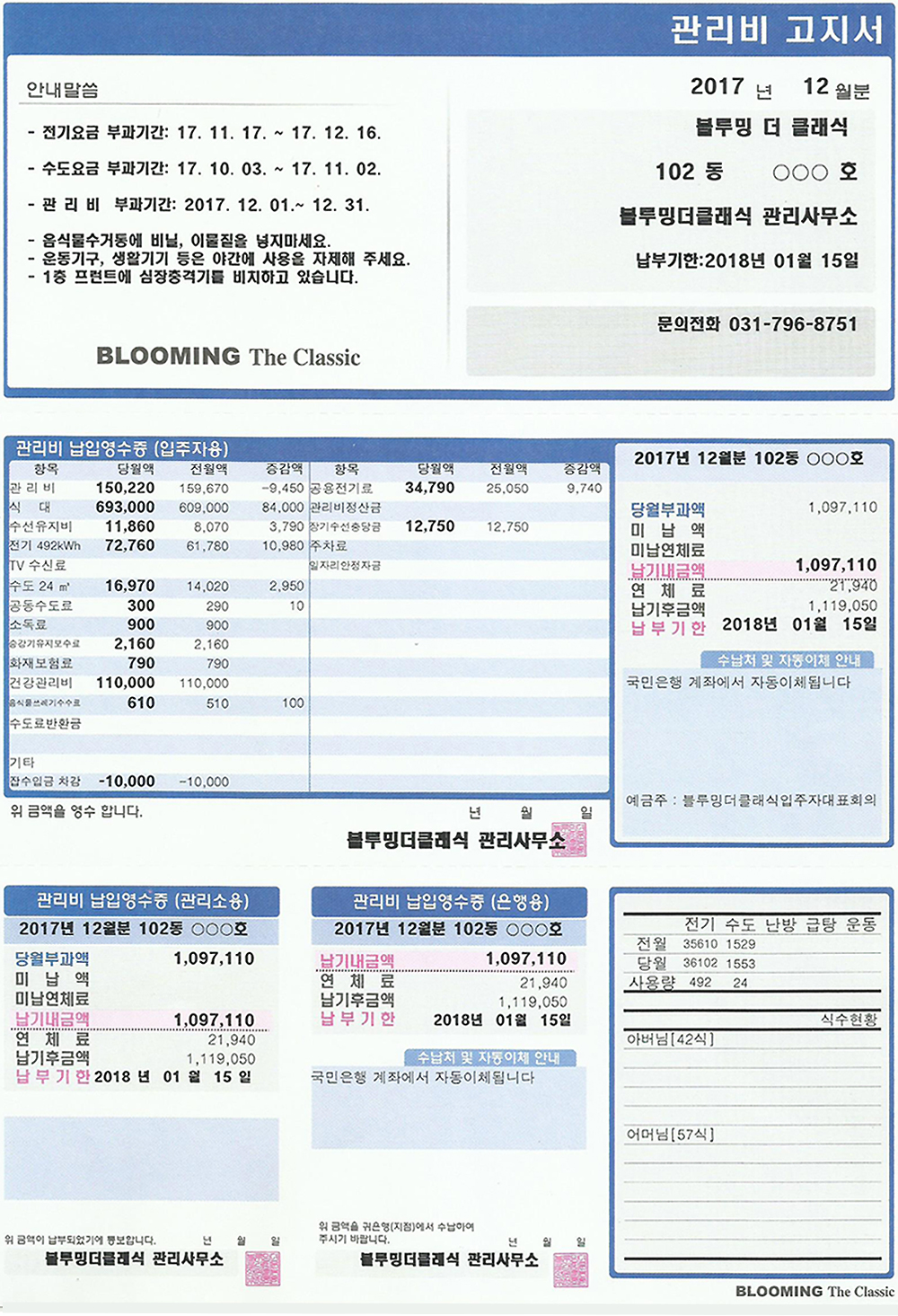실제 예) 부부2인 거주비용 동절기 하절기 고지서(식대,건강관리비포함)